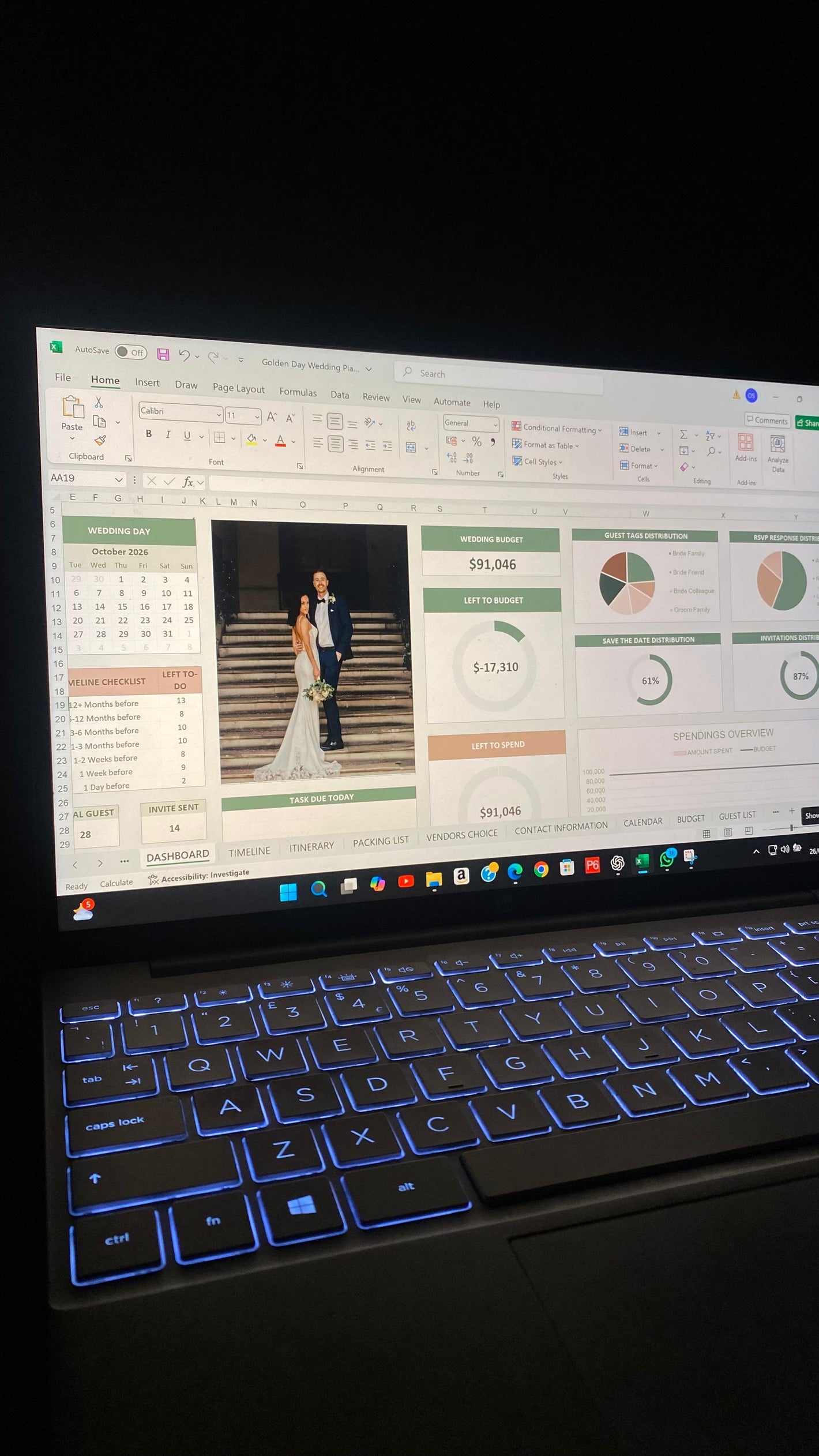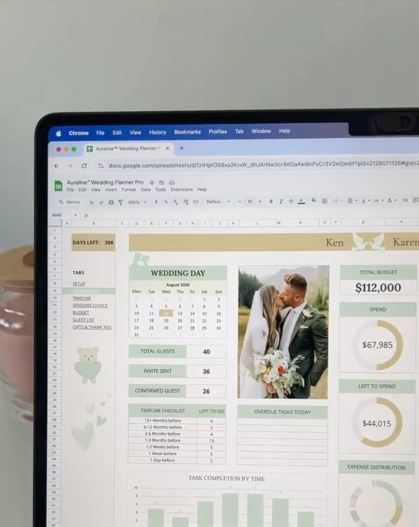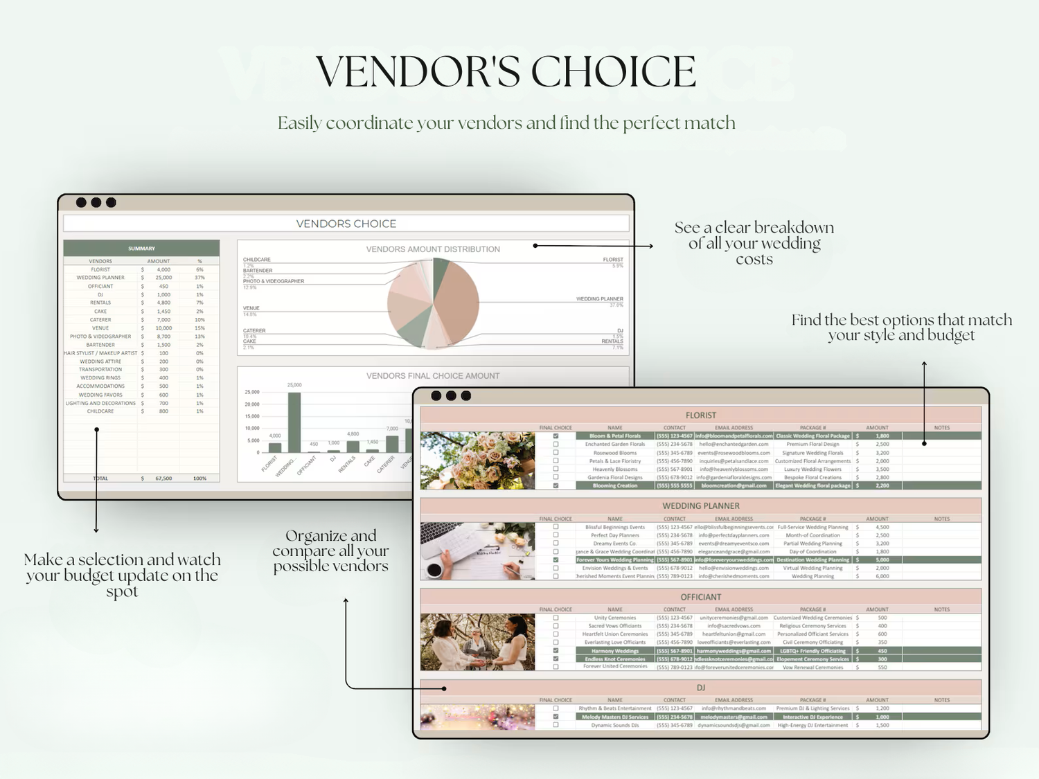 Easily manage your entire wedding budget, track spending, log payments, and monitor vendor costs in one simple sheet.
